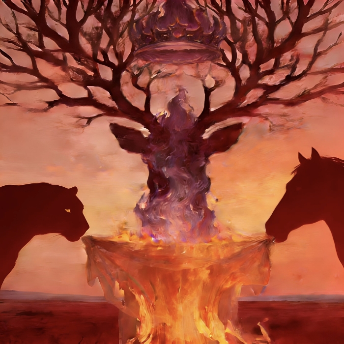 为首的生灵叼着一顶紫色的冠冕,从行的生灵共托着一件绯红的华服,整套服饰望上去像是血,却又仿佛在燃烧。