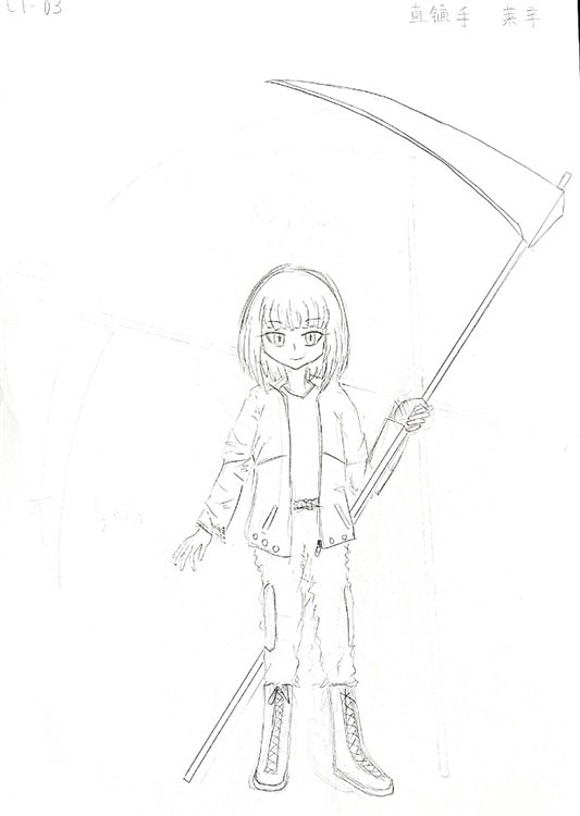 当先的是名活泼的女孩,身上穿着上橙下灰的冲锋衣外套和工装裤,脚上一双长靴,看上去就是精干的模样。手中举着一柄比她身高都要长的,像是神话故事里死神用的那种镰刀,昭示着她的职位。