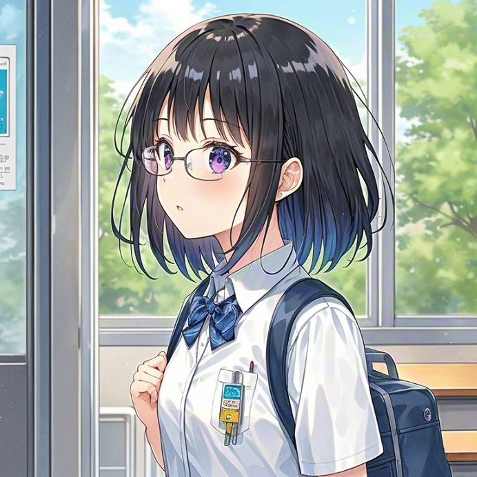 我看见她那墨黑的短发自然地下垂到肩膀,宛如春雨过后的细柳,柳枝轻盈地点着湖面;微卷的发梢与收束的末端犹如莲花瓣一般,既美丽动人又不妖娆银霏,有股君子之气,堪称“可远观而不可亵玩焉”。那发梢似乎蘸着幽蓝色的蓝莓酱,又似乎映出了夜晚晴空中的银河,那靓丽的钴蓝色令我不禁联想到晶莹剔透的琉璃和蓝宝石。她那细框眼镜后方藏着的眼瞳,映着深邃的幽紫色,恍如北极地区泛着极光的星空。她穿着纯白色的制服,领口别着一枚胸针,位于胸前的制服口袋则挂着一片金属长条——看上去像是游标卡尺。她抬起手挽起发梢,这时刚好一缕微风从前门轻轻拂过,她的短裙随风微微飘起,露出了洁白如玉无暇的大腿。