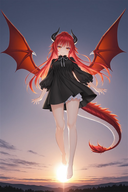 一双红黑纹的龙角从火红的头发间显现;一条长长的龙尾从她的身后冒出;一双龙翅膀从她的背后张开,富有力量地扑动着。