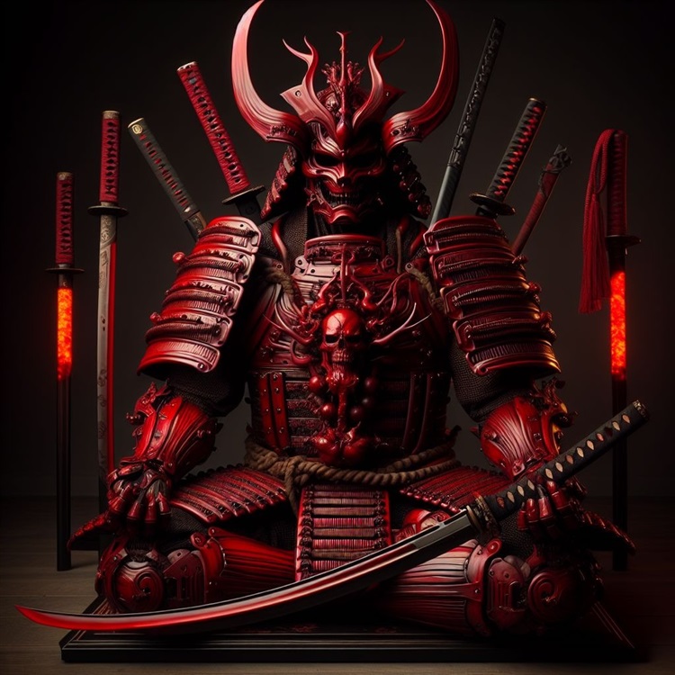 这套铠甲样式古朴而厚重,被称为“大铠”,甲片层层叠叠,边缘涂着暗红色的漆,像是凝固的血液,在火光下泛着诡异的光泽。战士的脸上佩戴着一个全覆盖的红色鬼面甲,鬼面的嘴角向上扬起,露出诡异似笑非笑又带点怒火的面容,眼窝的位置没有任何缝隙,取而代之的是两团跳动的红色火焰,仿佛有灵魂在其中燃烧,散发着慑人的气息。