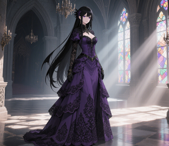 接着,她拿起深紫色长裙,小心翼翼地套上身。丝绸顺着皮肤滑落,贴合却不紧绷,冰凉的触感让她打了个哆嗦,却格外舒服。她走到房间中央的黄铜穿衣镜前,镜子表面有些氧化,却依旧能清晰映出她的身影——深紫色衬得她的皮肤像上好的羊脂玉,原本有些苍白的脸颊也多了几分血色;蓝色瞳孔在镜中格外明亮,与紫色礼服形成鲜明对比;原本因疲惫而有些憔悴的面容,也因为这件礼服焕发出光彩,像暗夜里突然绽放的花朵。