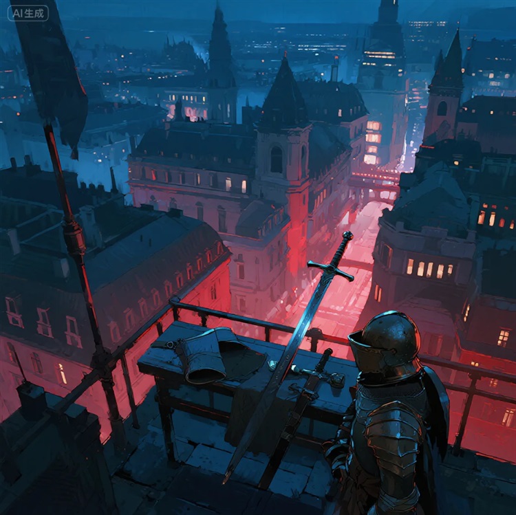 两人紧贴着冰冷的高塔外壁,沿着这圈环状“戒指”快速移动。刚绕过高塔的一个转角,就听到身后传来安格西气急败坏的咆哮:“站住!你们这两个窃贼!鼠辈!”只见安格西也踏上了萤石环带,他显然没有穿那身标志性的教皇冠冕和华丽长袍,只套着一件轻便的皮甲,面容因愤怒而扭曲,手中紧握着一把装饰极其奢华、镶嵌着宝石的长剑,剑尖直指两人。他身后的守卫们则只敢在门口探头探脑,看着这惊险的高空追逐,无人敢踏上这狭窄的死亡之路。