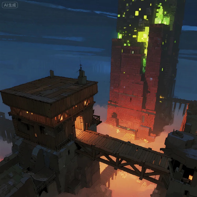 门外豁然开朗。凛冽的风瞬间吹散了室内的闷气。他们发现自己正站在一个巨大木质长方体建筑的平坦屋顶天台上。面前,一座同样宏伟的木质建筑与之并肩而立,两者之间由一道宽阔坚固的木桥相连。而最引人注目的,是旁边那座建筑顶部拔地而起、由暗红色石块(红石?)砌成的巨大高塔!塔身上镶嵌的无数萤石方块在暮色中散发着熟悉的黄绿色光芒。