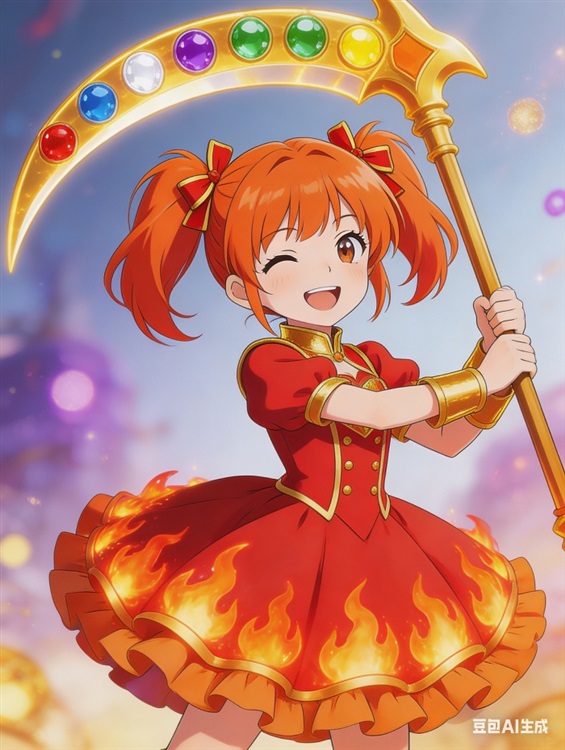 夏瑶的战斗服是一套以红色和金色为主色调的西式连衣裙,裙摆蓬松,层层叠叠的荷叶边上绣着火焰形状的纹路。