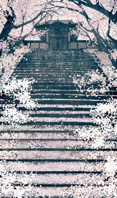青石长阶层层叠叠向上延伸,仿佛没有尽头,阶面落满细碎的樱瓣。