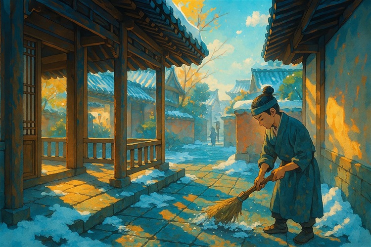 嘉祐三年正月廿八的巳时,汴京的残雪还没褪尽。苏府庭院里的青砖缝里嵌着雪粒,被日头晒得半融,踩上去发着 “咯吱” 的软响,像咬着块浸了水的棉絮。西跨院的回廊下,扫雪的仆役正用竹扫帚把雪归拢到墙角,竹枝划过青砖的 “沙沙” 声,混着远处巷口 “卖糖霜梅” 的吆喝,慢悠悠飘进苏清晏的窗里。