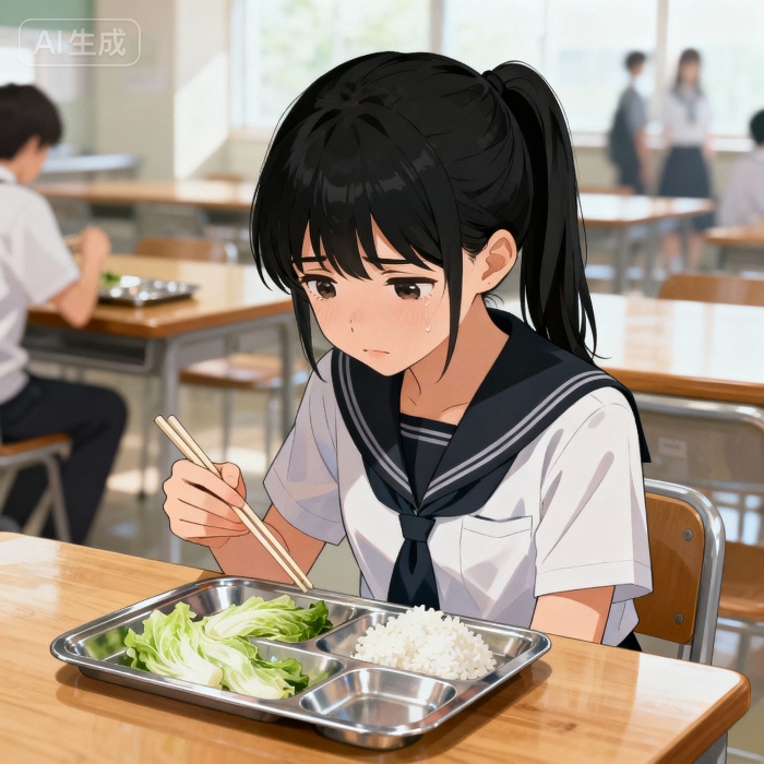 那些关于食物味道、关于分量的寻常对话,此刻像被放大了无数倍,清晰地钻进她的耳朵。每一句都像是在无声地提醒着她与他人的差距。她感觉脸颊发烫,握着筷子的指尖微微泛白。她不敢抬头与任何人对视,只能将头埋得更低,恨不得整个人都缩进校服里,只希望快点吃完,快点离开这个让她如坐针毡的地方。