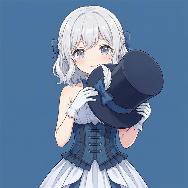 那是一副银发小女孩的画像,画面中的她穿着蓝白色的长裙,抱着一顶和自己很不合适的大黑帽子,以天真和好奇的目光注视着观众,好像透过了纸张和相框看到了他的心灵。