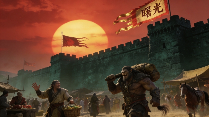 残阳如血,将曙光帝国与兽族接壤的边境雄关——彼岸堡,晕染出一片苍凉的赤金。高大的城墙由青黑色的巨石垒砌而成,墙垛上旌旗猎猎作响,隐约可见“曙光”二字在风中猎猎招展。城墙之下,是人族与兽族贸易往来的喧嚣集市,叫卖声、马嘶声、兽吼般的粗犷谈笑交织在一起,汇成了边境独有的嘈杂乐章。