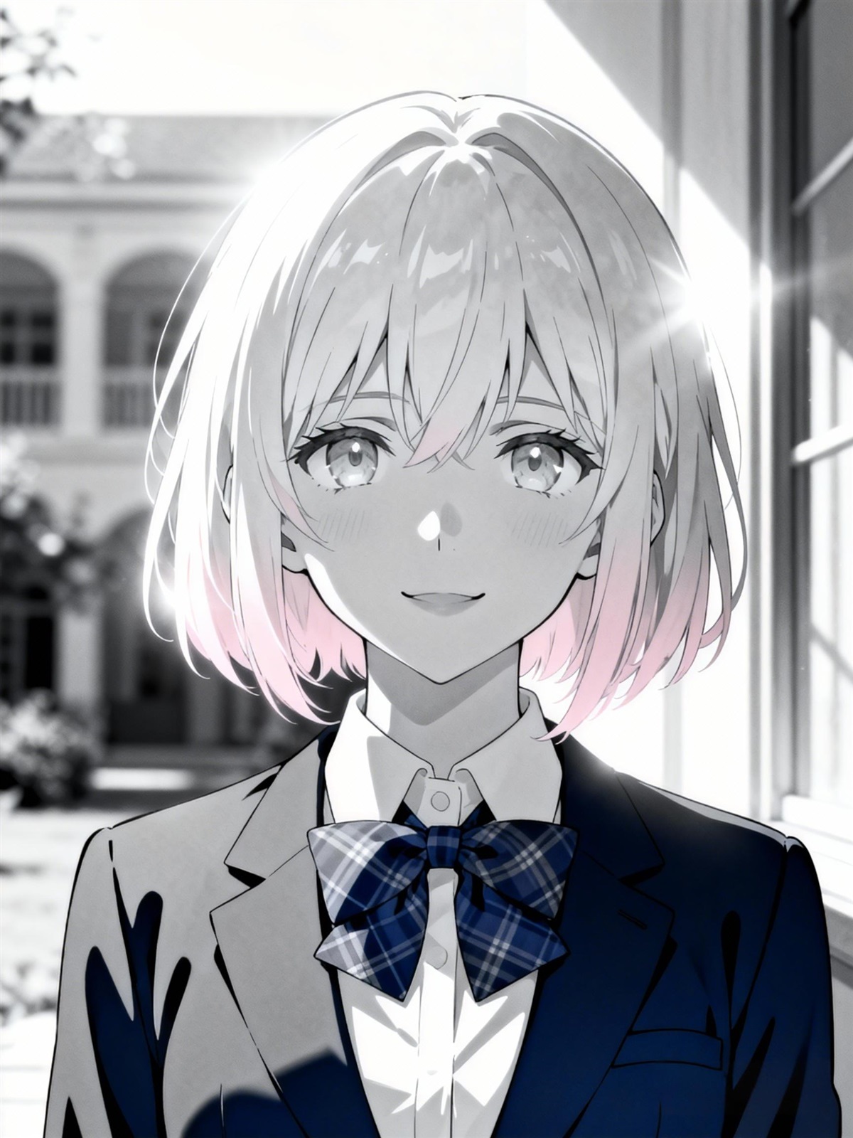 少女有着罕见而美丽的粉白色齐耳短发,发梢微微内扣,衬得她的小脸更加精致。一双湛蓝如晴朗天空的眼眸清澈明亮,眼角微微下垂,天然带着一种温柔无辜的气质。她穿着圣罗斯那学院标准的女生制服——白色衬衫、深蓝色格子领结和短裙,外套一件剪裁合体的深蓝色学院制服,裙摆下是穿着白色长袜的笔直小腿。阳光洒在她身上,仿佛给她整个人镀上了一层柔和的光晕。