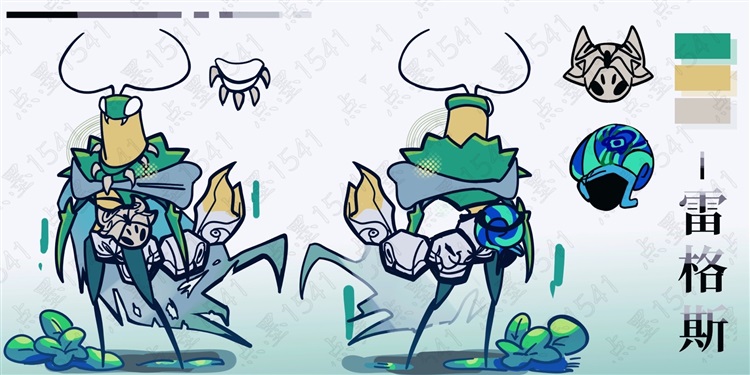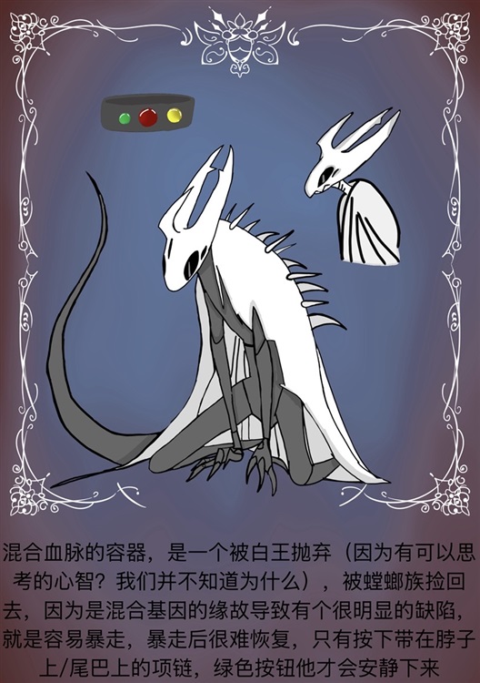 介绍:是一只种族混合的容器,在幼年时候因为某些原因(大概是有能力思考?有心智,)被沃姆抛弃,随后被螳螂族带回,在族里遇到了伴侣雷格斯幼年时候,对伴侣很忠诚,但对其他人白切黑。长大后喜欢粘着伴侣,在伴侣生产后会去捕猎,保护着伴侣和孩子,因为有角狐的基因,身上有代表森林生命的符文(只有在暴走或者雷格斯受伤后才会显现,其他时间里都是隐形的),同时也是因为是混合血脉所以头壳是有嘴的