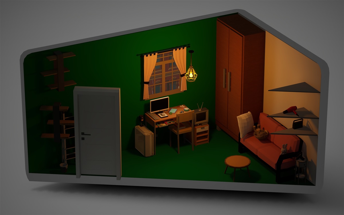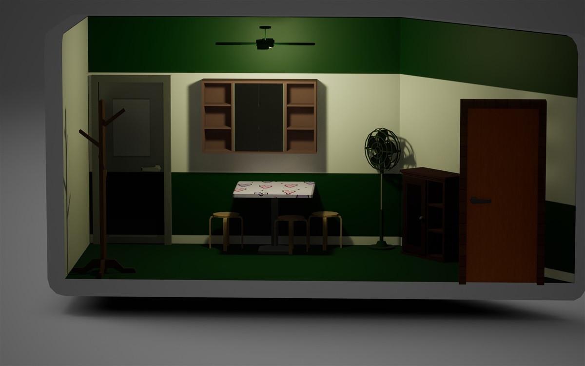 和房间不同的是,客厅墙壁还留了一些白色的部分,没有整个都被抹成绿色。