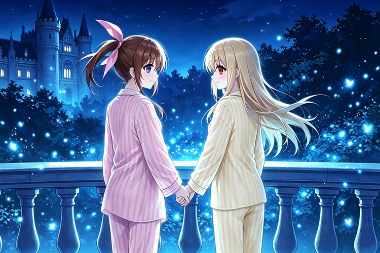 聊着聊着,话题渐渐从严肃的学习转向了轻松的闲聊。灵琳的目光不经意间扫过依偎在一起讨论的奈叶和菲特,红瞳中那熟悉的、想要找点乐子的小恶魔神色再度冒出。