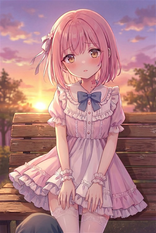 芫芫双手乖巧地撑在膝盖两侧,小腿在半空中轻轻晃荡着。那双琥珀色的眸子直直地盯着远处那轮燃烧的落日,夕阳的光辉倒映在她清澈的瞳孔里,仿佛在她眼中点燃了两簇小小的火苗。她白皙的脸颊被晚霞映照得通红,连那细软的粉色发丝似乎都镀上了一层梦幻的金边。
