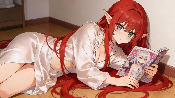 这只精灵侧躺在房间的地板上,红色的长发拖在地上,灰色的瞳孔中满是慵懒,左手手上拿着一本恋爱漫画,似乎在她们进来前还在阅读。