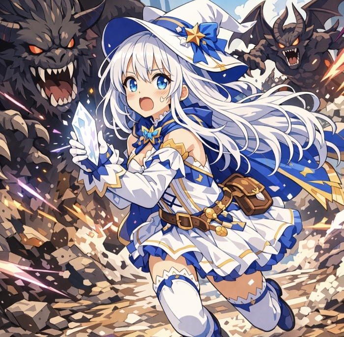 水晶的光芒逐渐黯淡,越来越多魔物开始逼近艾莉斯,就在魔物的利爪即将触碰到她咽喉的瞬间,裂隙中突然坠下一道耀眼的金色光柱。光柱落地时炸开的气浪掀飞了周遭的魔物,艾莉斯下意识地抬手遮挡,却见光柱中缓缓走出一个身着陌生服饰的少女。