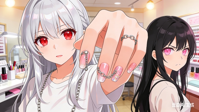 白川桜的指甲如同微型铠甲,银黑相间带着尖锐的装饰;春文秋夜的则是优雅的粉白渐变,指尖点缀着小巧的珍珠。