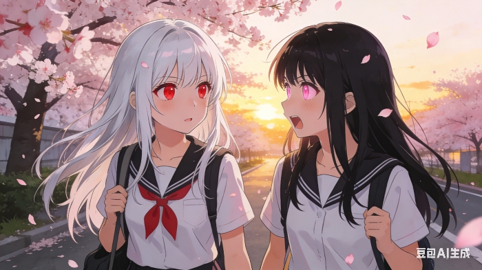 白川桜往后甩了甩她那头引人注目的银白色长发,红色眼眸在夕阳下闪烁着顽皮的光芒,