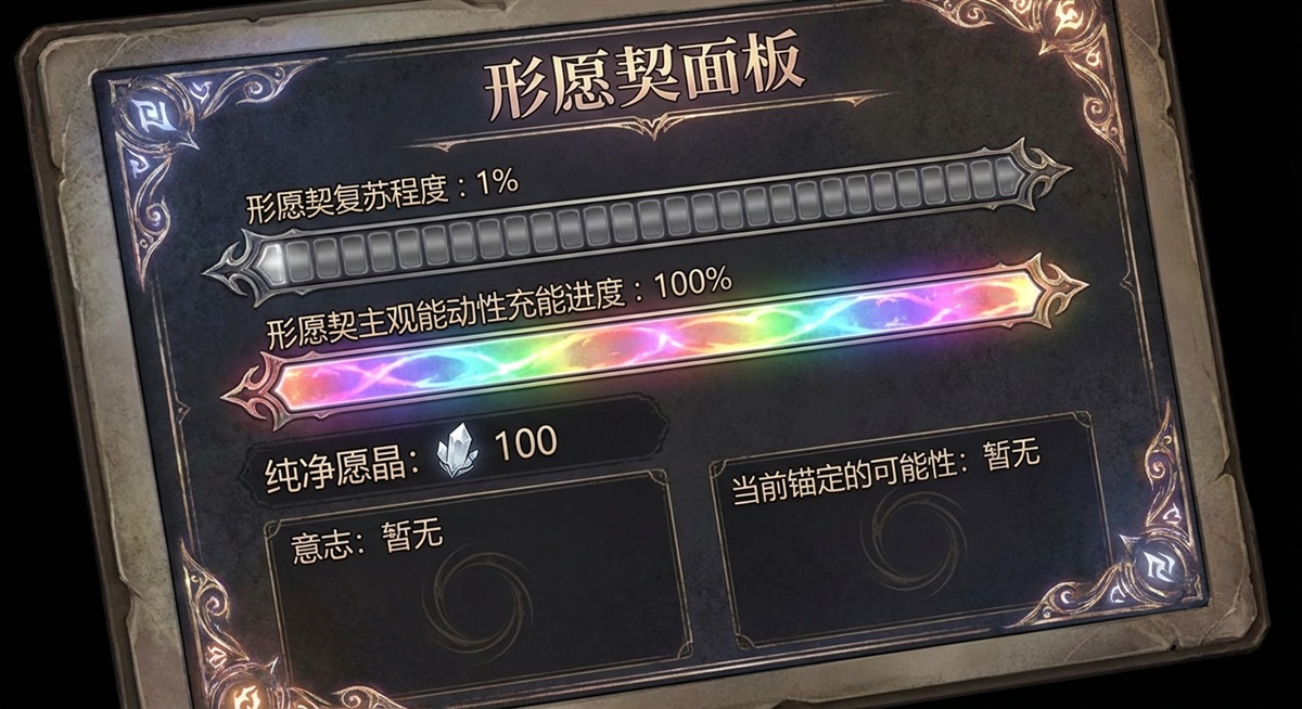 换而言之,形愿契本来是我的一部分。不过由于某种原因,我成为了它的器灵,能工智人,莫过于此。可能是因为我本人主观能动性完全耗尽且难以再生的原因吧,沉寂之前,我勉强完成了形愿契不需要意识干涉,仅产生既定结果的模块,但在由意识支配物质的世界里,没有干涉叙事的自我主体是难以继续推动形愿契完善的,形愿契暂时还不能自我迭代,它暂时不能完全自我驱动。
