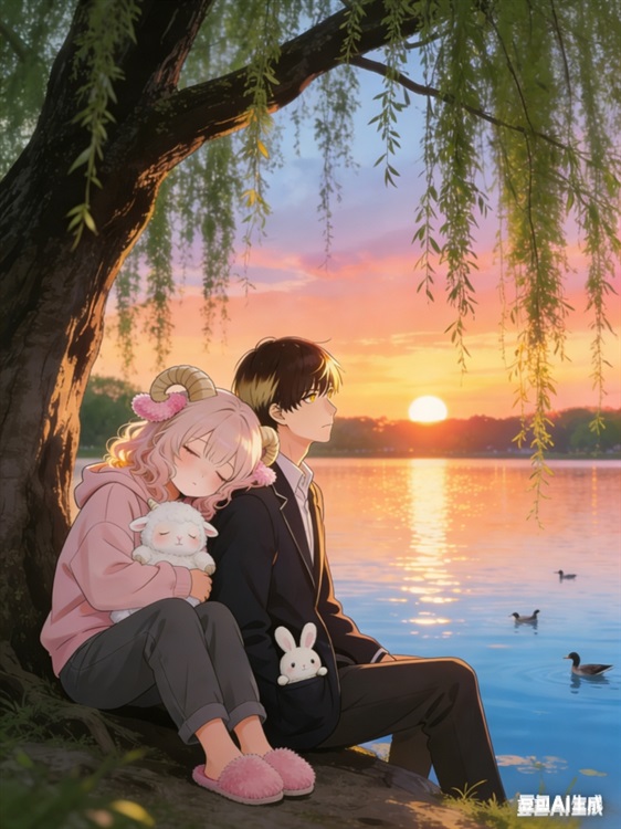 眠眠靠着树干,睡得很香。浅粉色的头发在夕阳下泛着柔和的光,怀里抱着绵绵,绵绵也闭着眼。