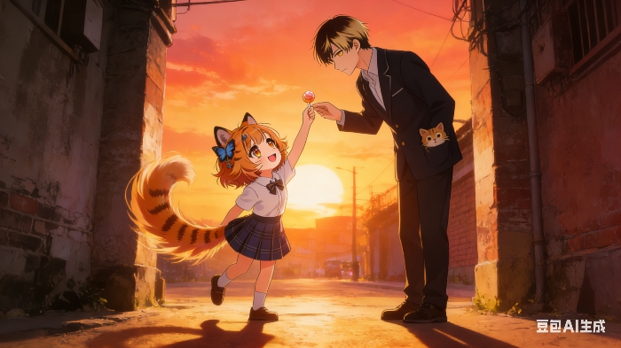 她背着小书包,猫耳竖得笔直,尾巴一晃一晃的。