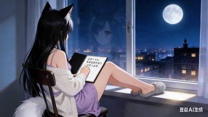 她坐在窗前,面前摊着那本黑色笔记本。月光从窗外照进来,落在她身上。