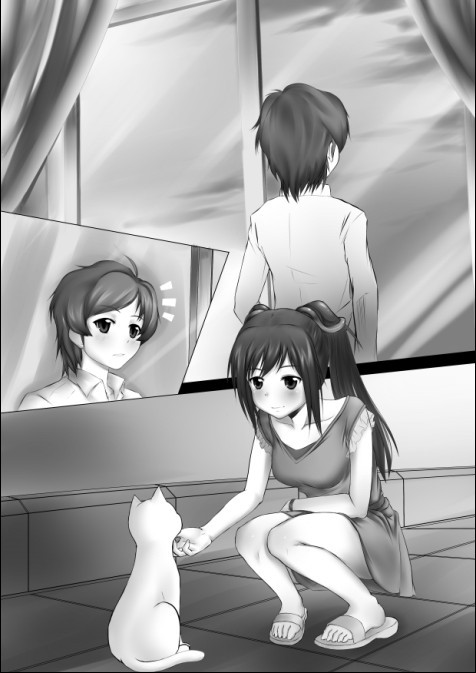 橙衣不知什么时候也出现在我和那个粉发女孩旁,然后用一种快要哭泣般的眼神看着我们两个“紧紧相拥”的男女。