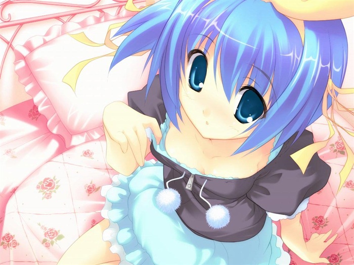 蓝色的头发深蓝色的水晶眼睛可爱的黑色背心不过就是短了点,淡蓝色的短裙