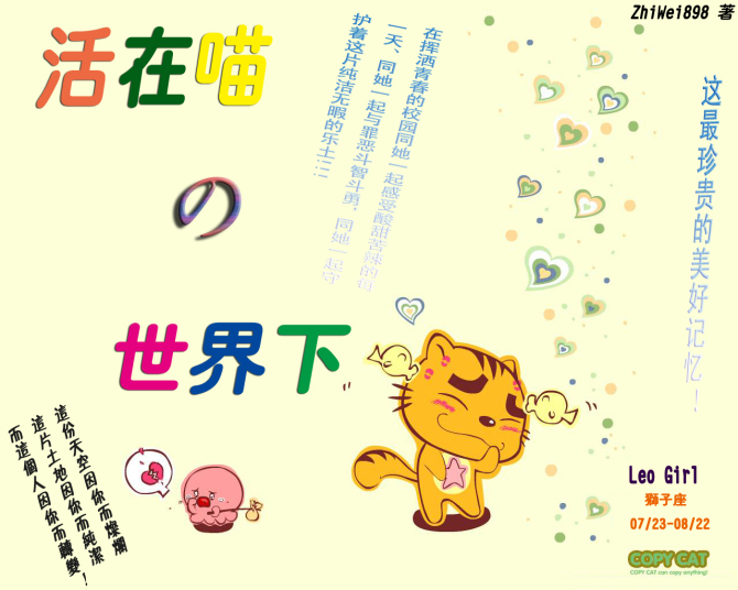 中六生,其实他是经常带着帽子的呢,帽子下隐藏着什么?难道着秃头头?!!没有火气的性格,但每天都会那么神经质一回,每当喵喵出现时,他几乎都会出现在一旁,心里喜欢着喵喵...
